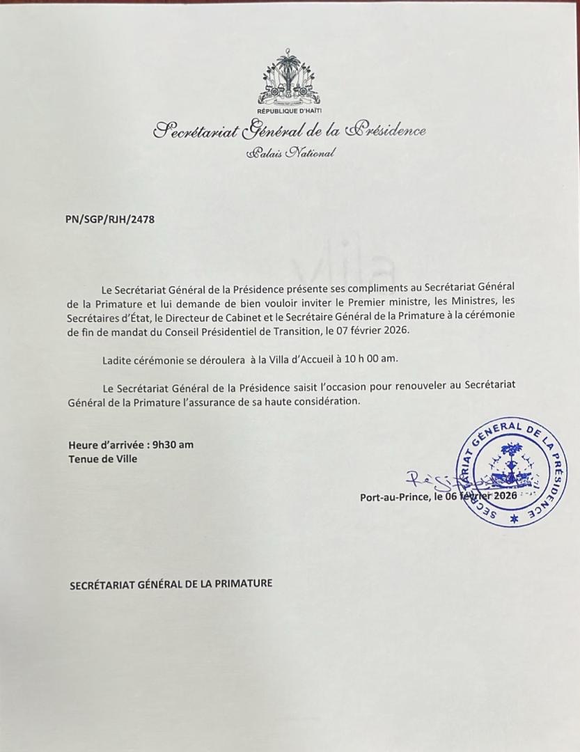 Le Secrétariat Général de la Présidence a officiellement invité le Premier ministre, les membres du gouvernement et les principaux collaborateurs à la cérémonie marquant la fin du mandat du Conseil Présidentiel de Transition (CPT). Cet événement solennel se tiendra ce samedi 7 février 2026 à 10h00 à la Villa d’Accueil, à Musseau (Delmas), dans la banlieue nord-est de Port-au-Prince.
